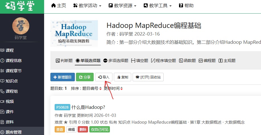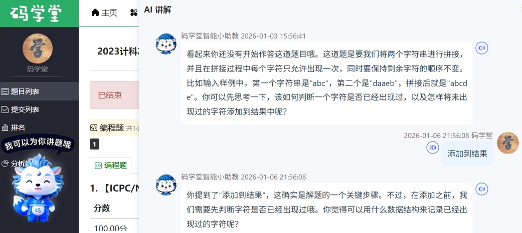 感谢一直对码学堂支持的同行、朋友及师生们! ### 2025年11月12日 `码学堂团队`:新增码学堂AI智能助手 `功能更新:2025年11月12日`  ### 2025年07月15 `码学堂团队`:新增“主观题”自动测评功能 `功能更新:2025年07月15日`  ### 2025年03月15 `码学堂团队`:新增题目批量导入功能 `功能更新:2025年03月15日`   ### 2024年12月26日 `福建省南平市建溪学校梁老师`:关于题解标签智能显示的建议:练习或考试中题目无解析内容、有题目解析内容这两种情况下“题解”标签都会显示,是否可以让题解标签做到智能显示:在无题目解析内容时“题解”标签隐藏、在有题目解析内容时“题解"标签显示。如果所有题目都显示“题解”标签,在教学上不方便。因为一般只有少数难题才有题目解析内容,那么学生在答题后点“题解”发现大部分情况下是空的,老师也不一定记住哪些题目写了题解,让学生和老师都多耗了时间和注意力。 `功能更新:2024年12月27日`  ### 2024年07月15日 `福建省南平市建溪学校梁老师`:当教师在"教学活动—>练习.作业/考试/竞赛”对具体“题目集”做“编辑”时,选择了“不选择时,结束前客观题不显示测评结果与分数,如选择题、判断题与填空题”这一项,那么当学生进入该“题目集”答题时,对于“题目列表“界面右侧的”单项选择题“等客观题的测试结果显示:是否在目前设置“对”为绿色、“错”为红色的基础上,设置“未答题” 为白色。 `功能更新:2024年08月11日` ### 2024年03月16日 `码学堂团队`:开放题目集的“题解”功能,学生可在查看老师设置的题目解析。 `功能更新:2024年03月16日` ### 2024年03月03日 `福建省南平市建溪学校梁老师`:在课程界面中,希望题目能原地复制,也能迁移到另一课程。以及题目导入功能。能从练习·作业中迁移到考试、竞赛或反方向操作。 `功能更新:2024年03月06日` ### 2024年01月30日 `福建省南平市建溪学校梁老师`:一个建议:编程题的测试数据目前可以批量上传,是否可以设计一个批量下载的功能,方便教师对测试数据的复用以及备份? `功能更新:2024年01月31日` ### 2023年07月02日 `福建省南平市建溪学校梁老师`:在练习.作业大类里:在排名中,学生答案正确用绿块标记,错误用红块标记,很方便。但在题目列表中,右侧的列表用绿底表示已答,红底表示当前选中的题。而学生往往误解为绿底表示已答且正确,红底以为是已答且错误。建议:如果老师在创建题集时勾选即时显示判题结果,那么在题目列表中,就以绿底表示已答且正确,红底表示已答且错误,以粗黑字表示当前选中的题。目标:避免学生误解,快速定位要订正的错题。 `功能更新:2023年07月04日` ### 2023年06月20日 `码学堂团队`:增加考试是否强制独占设置,选择后,学生在考试期间将不能打开考试以外的其他码学堂资源。 ### 2022年12月15日 `福建省南平市建溪学校梁老师`:如果一套题中除了有编程题还有客观题(如单项选择题),客观题要等到练习时限到了才能自动判题并看到得分,但如果是线上教学/远程教学,学生完成“练习·作业”的时间不固定,教师会设置一个较长的时限如1~2天,这样的话,客观题和编程题的自动判题有时间差就不够友好了,希望加入教师可以自动设置客观题(如单项选择题)显示测评结题与成绩的功能。 `功能更新:2023年1月11日` ### 2022年12月17日 `码学堂团队`:在学生组管理中,增加了生成二维码功能,教师分享二维码后,学生使用微信扫码即可加入学生组。 ### 2022年12月13日 `码学堂团队`:考试系统中增加了学生重新抽题的功能。 ### 2022年10月19日 `码学堂团队`:增加了教师用户开通学生账号功能、重置学生密码功能。 ### 2022年10月15日 `码学堂团队`:增加了微信扫码登录功能。 ### 2022年10月12日 `码学堂团队`:增加了教学工具功能。 ### 2022年10月11日 `码学堂团队`:增加了问卷功能。 ### 2022年8月24日 `贵州师范学院熊院长`:授课中,教师提问后,原来在线播放的PPT会重新加载,又得找回到原来位置,浪费了教学时间,建议使用其他功能时,PPT播放停留在原来位置。 `功能修复:2022年8月24日` ### 2022年8月22日 `码学堂团队`:新增课程的“授备课”功能,教师可在线完成教学设计,课堂上可使用码学堂授课。 `功能更新:2022年8月22日` ### 2022年8月5日 `四川仁寿实验中学邹老师`:课程导学中,学生闯关页面在Microsoft Edge上偶尔出现题目看不见的情况。 `功能修复:2022年8月5日` ### 2022年6月6日 `福建省南平市建溪学校梁老师`:建议加入hack fonts字体,不然学生很容易把l和1搞错。 `功能更新:2022年7月10日` ### 2022年5月15日 `山东寿光现代中学隋老师`:建议加长用户邮箱限定的字符数。 `功能更新:2022年5月15日` ### 2022年5月10日 `四川仁寿实验中学邹老师`:建议增加公开题目的收藏夹功能,并增加自定义标签功能,便于老师自己分类。 `功能更新:2022年7月9日` ### 2022年4月8日 `织金育才学校谢老师`:(1)建议增加“题目集”的删除功能,采用回收站形式;(2)建议在成绩排名、提交列表中增加“仅看本组”学生的权限,便于对各班级学生的学习行为进行管理。 `功能更新:2022年4月13日` ### 2021年12月 `贵州师范学院崔教授`:建议增加题目的删除功能。 `功能更新:2022年4月13日` ### 2019年12月16日 `贵州师范学院袁老师`:建议在填空题自动判题的基础上,增加老师手动评阅的功能。 `功能更新:2019年12月18日` ### 2019年12月以前 很多同行与